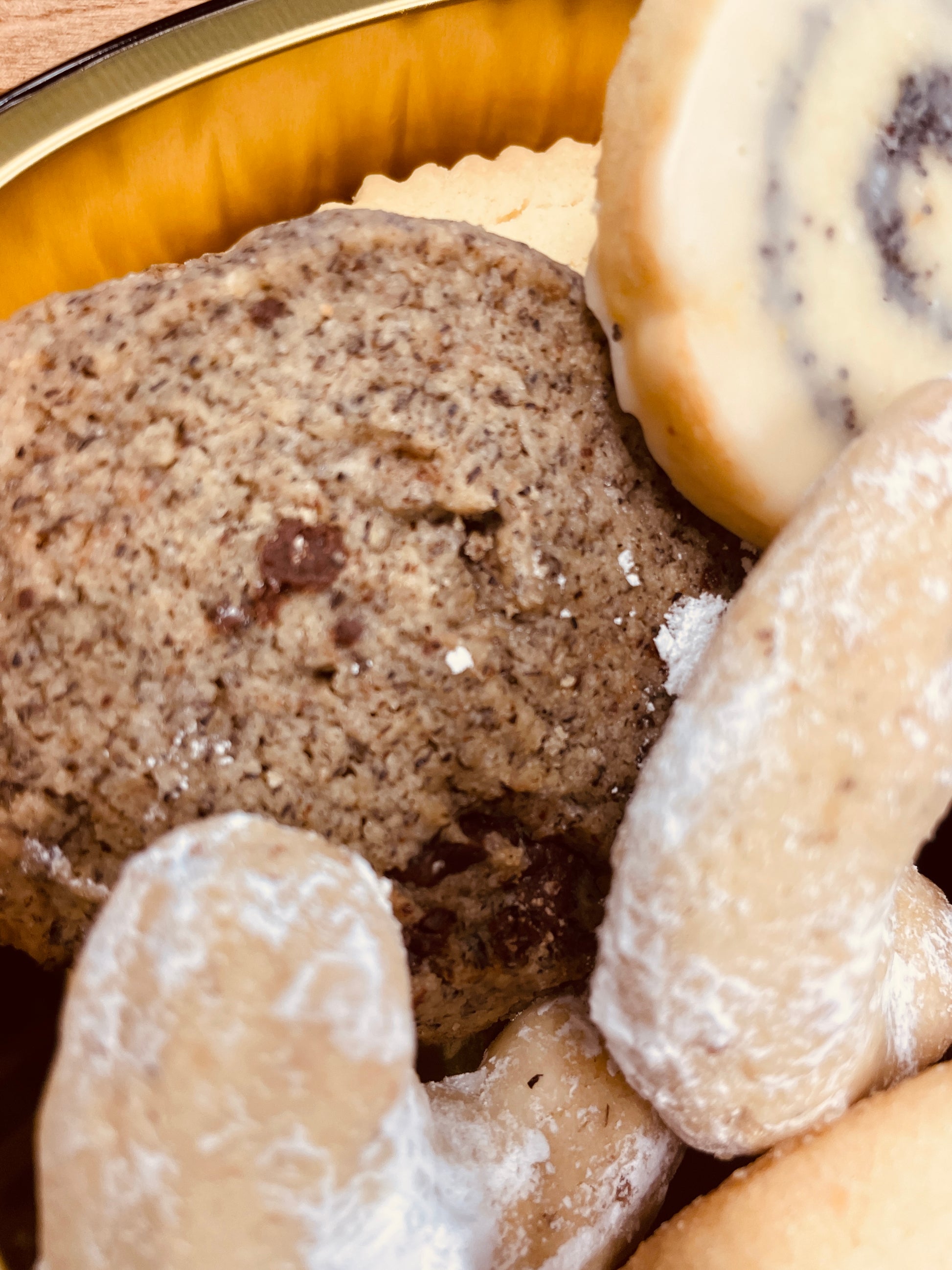 (Assortment of: Linzer Cookies, Crescents, Chocolate Chai Shortbread, Classic Shortbread, German Butter Cookies Wreach, Orange Poppyseed, Austrian Plum Cookie, Buckwheat Sable, Ginger Spice Cookies, Fig and Gingerbread Squares, Pine nut Caramel Shortbread Squares.)