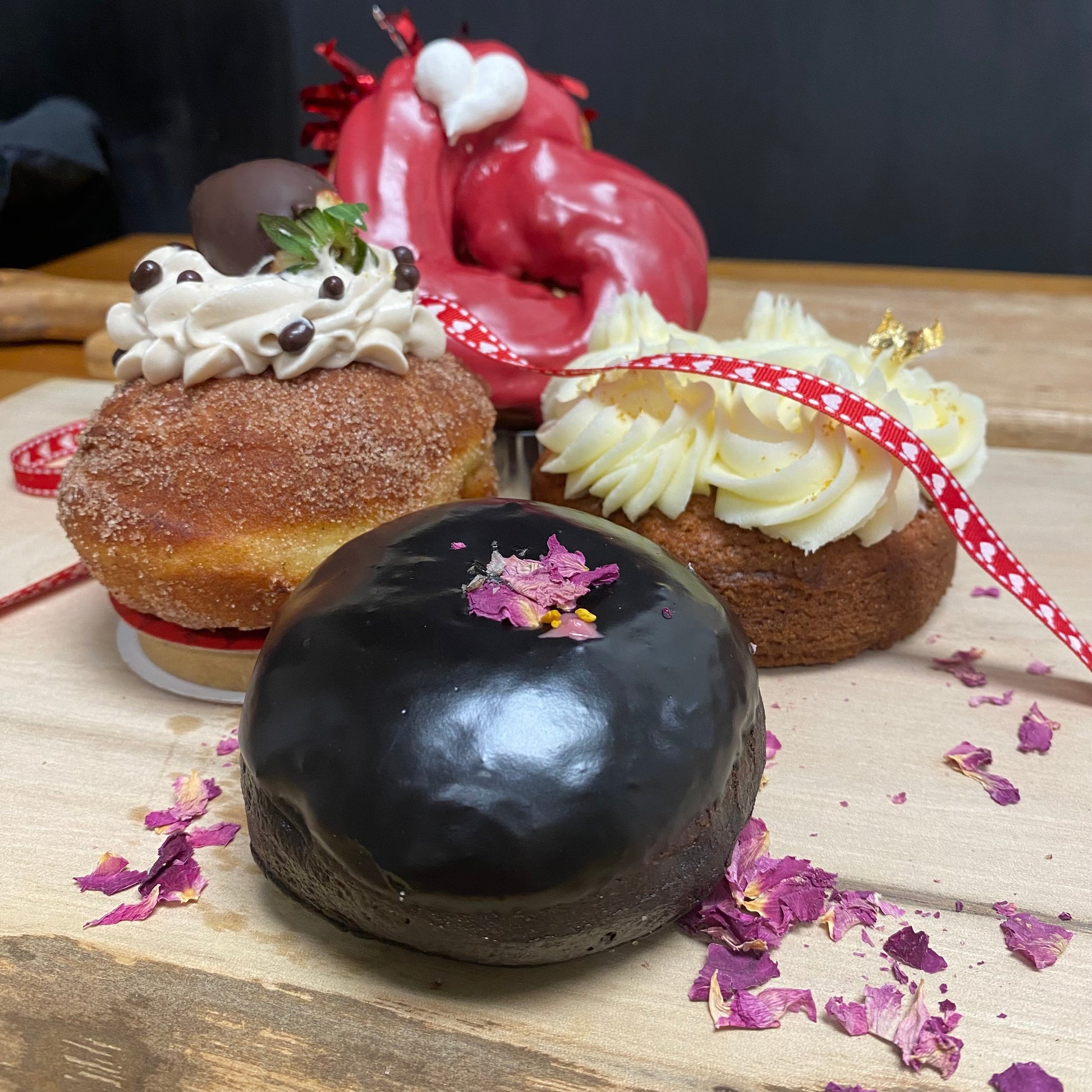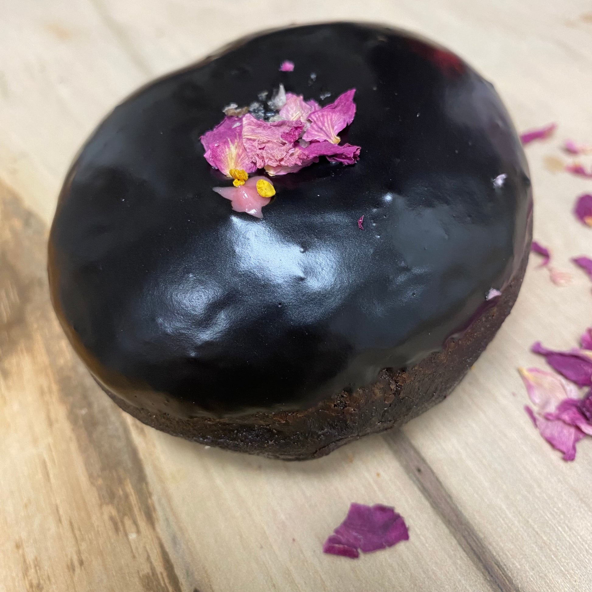 Embrace the shadows with the Midnight Rose. Encase in jet-black cocoa brioche is a tart blackberry and rose water reduction that bleeds romance. Topped with rose petals, bee pollen and smoked Maldon salt for a love that's complex, deep, and anything but ordinary.