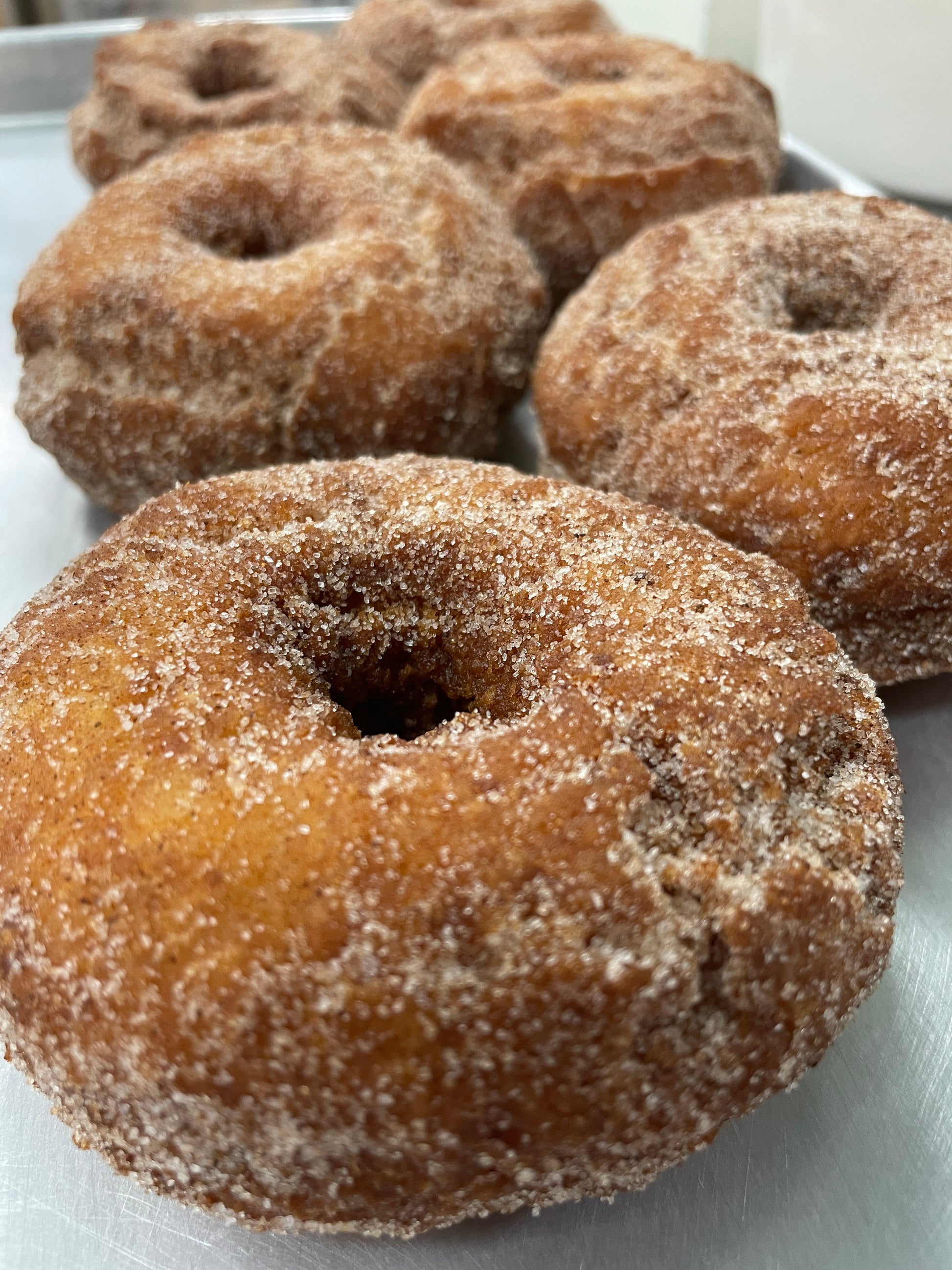 A delicious potato cake doughnut with a texture and taste similar to an old fashion plain dusted with cinnamon sugar.