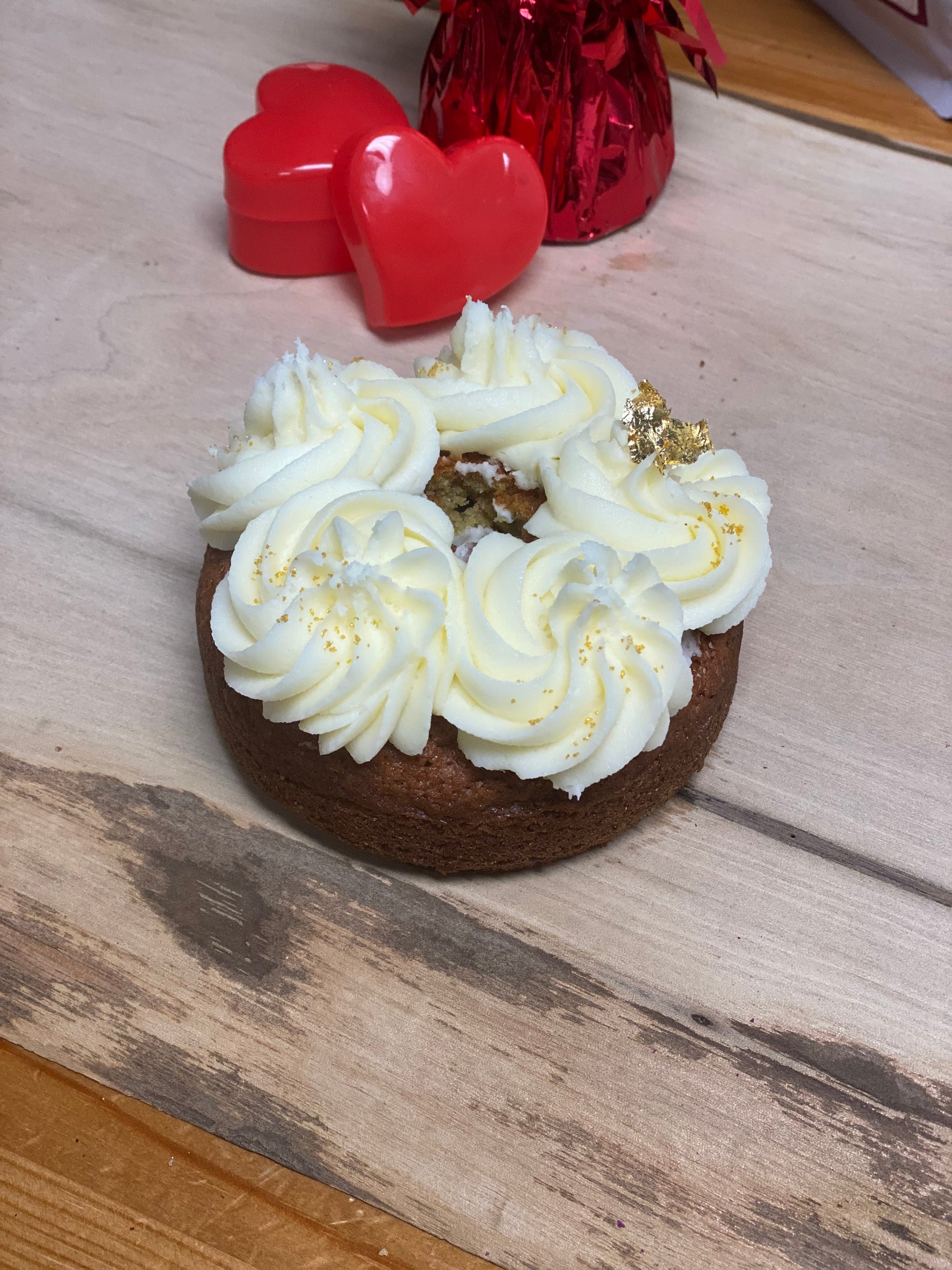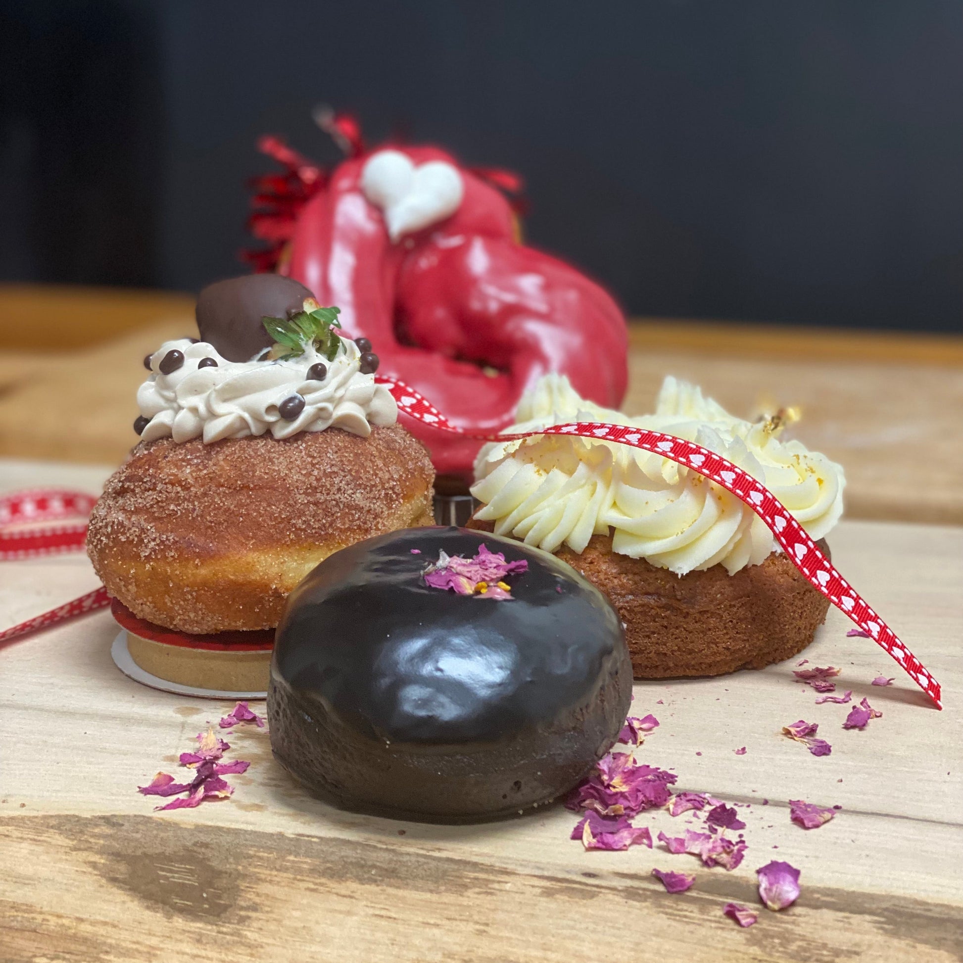 1 - The Alchemist's Crown: Meet the Alchemist's Crown our valentines surprise. A unique, golden-crumbed velvet doughnut, finished with velvety cream cheese frosting and a delicate gold leaf. A rare treasure for your favourite person (or yourself).